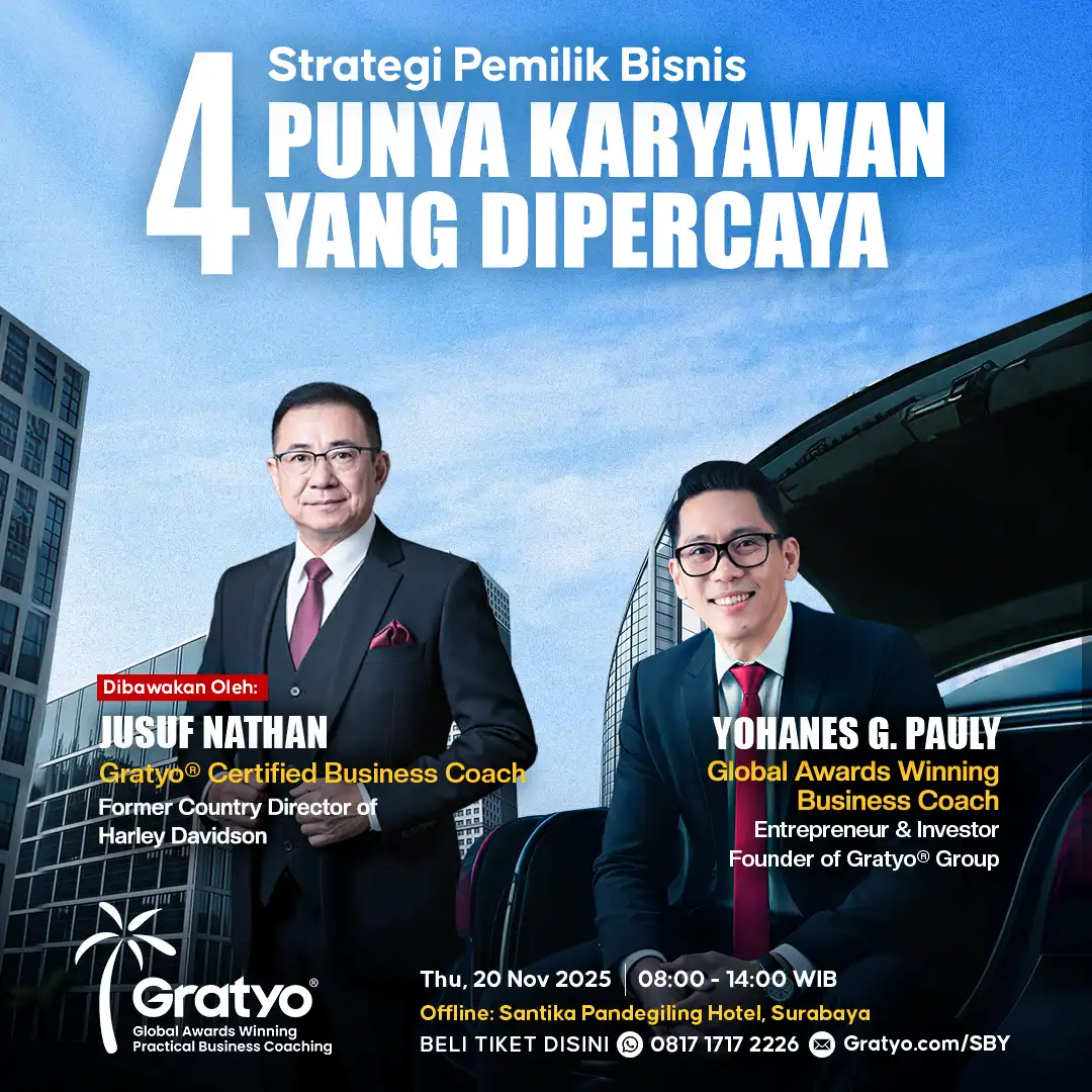 Bersama puluhan high-calibre Certified Business Coach di Gratyo® Global Awards Winning Practical Business Coaching Company berhasil membantu bisnis dengan revenue miliaran hingga triliunan rupiah go to the next level, bisa IPO, hingga bisnis Profitable & AUTO-PILOT™.